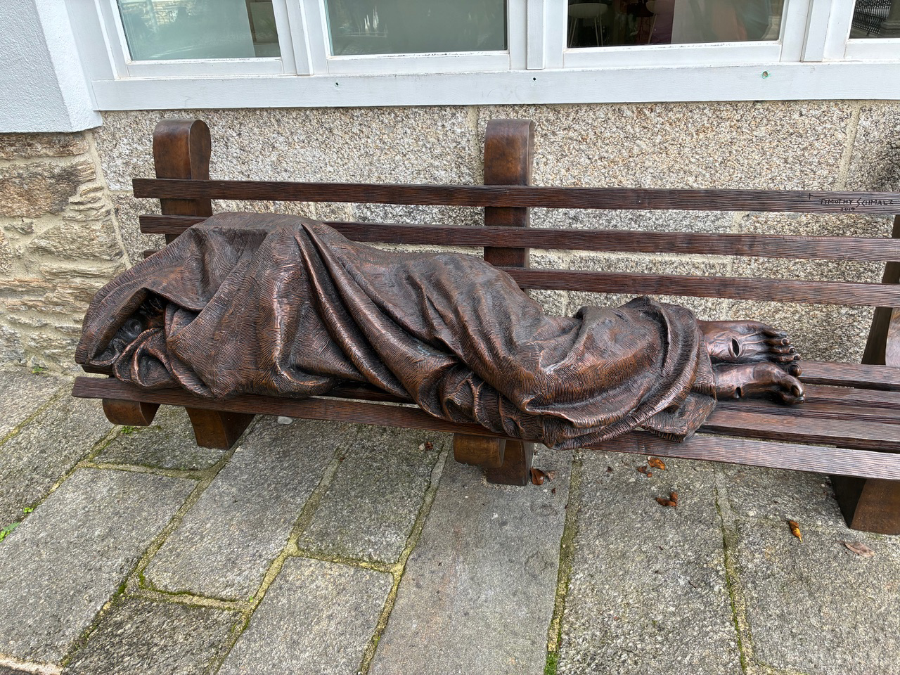 Behind the offices is a courtyard and a sculpture of a pilgrim resting on a bench. Yet on closer inspection we notice the sculpture’s title: “homeless Jesus.” The feet are pierced. We recognise the Lord. This reminds me how at the end of our spiritual journey we will need to rest.