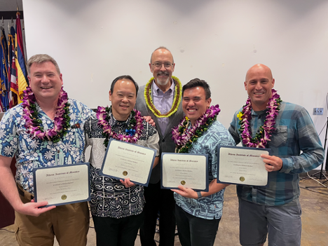 In the first photo you can see our most recent AIM-Pacific graduates: James McMillan-Chau, Jackson Jen Chieh Cheng (AIM-P instructor, graduating with highest honors), Micah Joichi Pomaikai Kaaihue, and Wouter Roux. Graduated but not picture: David Johnson (Sydney, Australia). Also Paul Slater (London, UK). Paul took the entire course online, through the AIM-US Mainland program headed up by Joey Harris (Augusta, Georgia). Congratulations to all! In the next picture I'm standing next to Anthony Galang, who has been leading the O'ahu church for many years, and has been tremendously supportive of the AIM program. (Thank you, Anthony!)